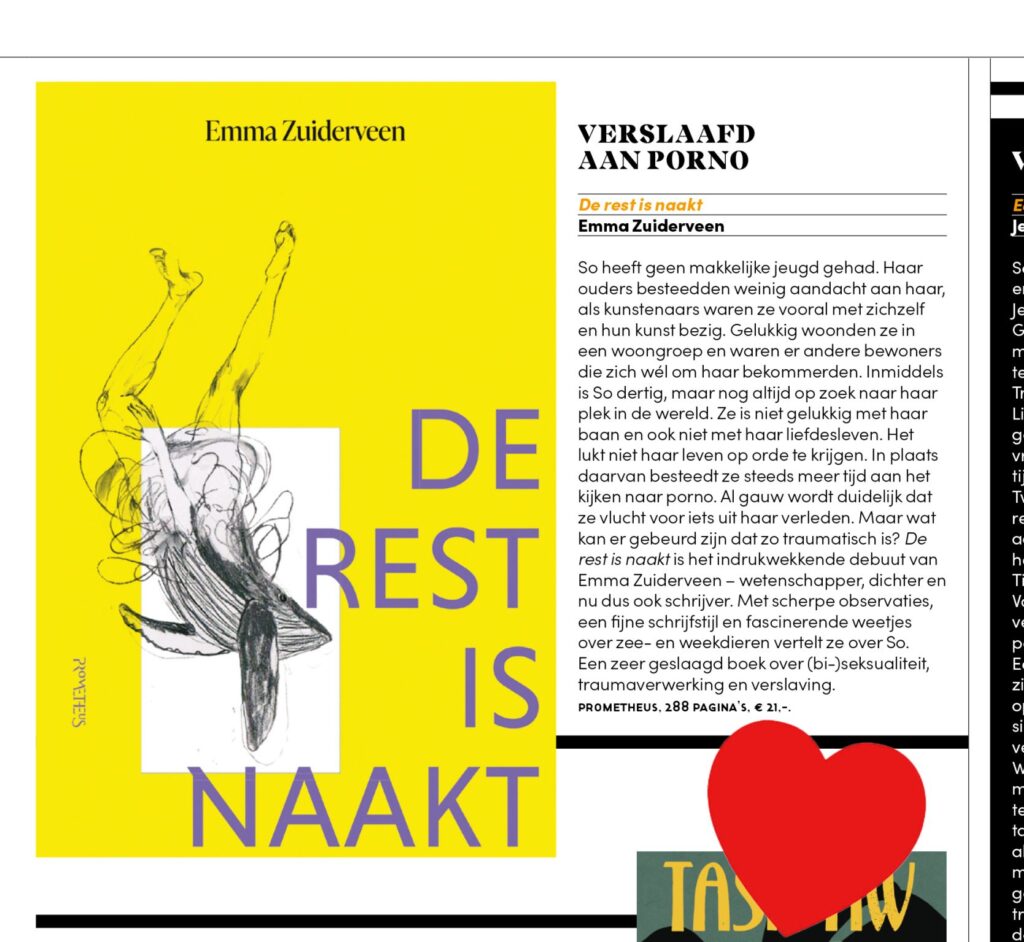 Chef Volkskrant Magazine Aimée Kiene gaat in deze aflevering in gesprek met Esma Linnemann en met Emma Zuiderveen, auteur van De rest is naakt (Uitgeverij Prometheus), een roman over een vrouw die kampt met een pornoverslaving. Ook schuift therapeut Hannah Cuppen aan, bekend van het zelfhulpboek Liefdesbang.